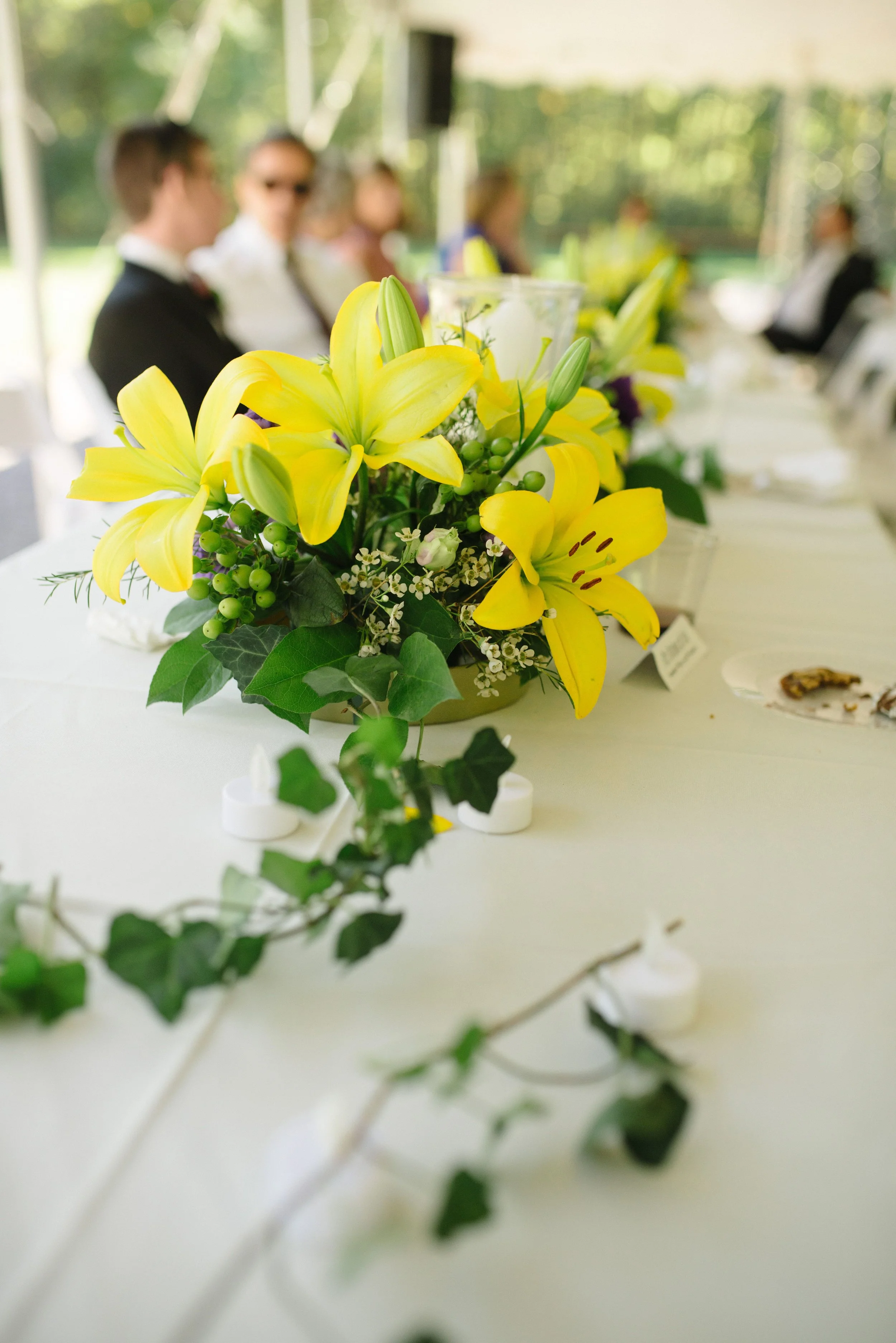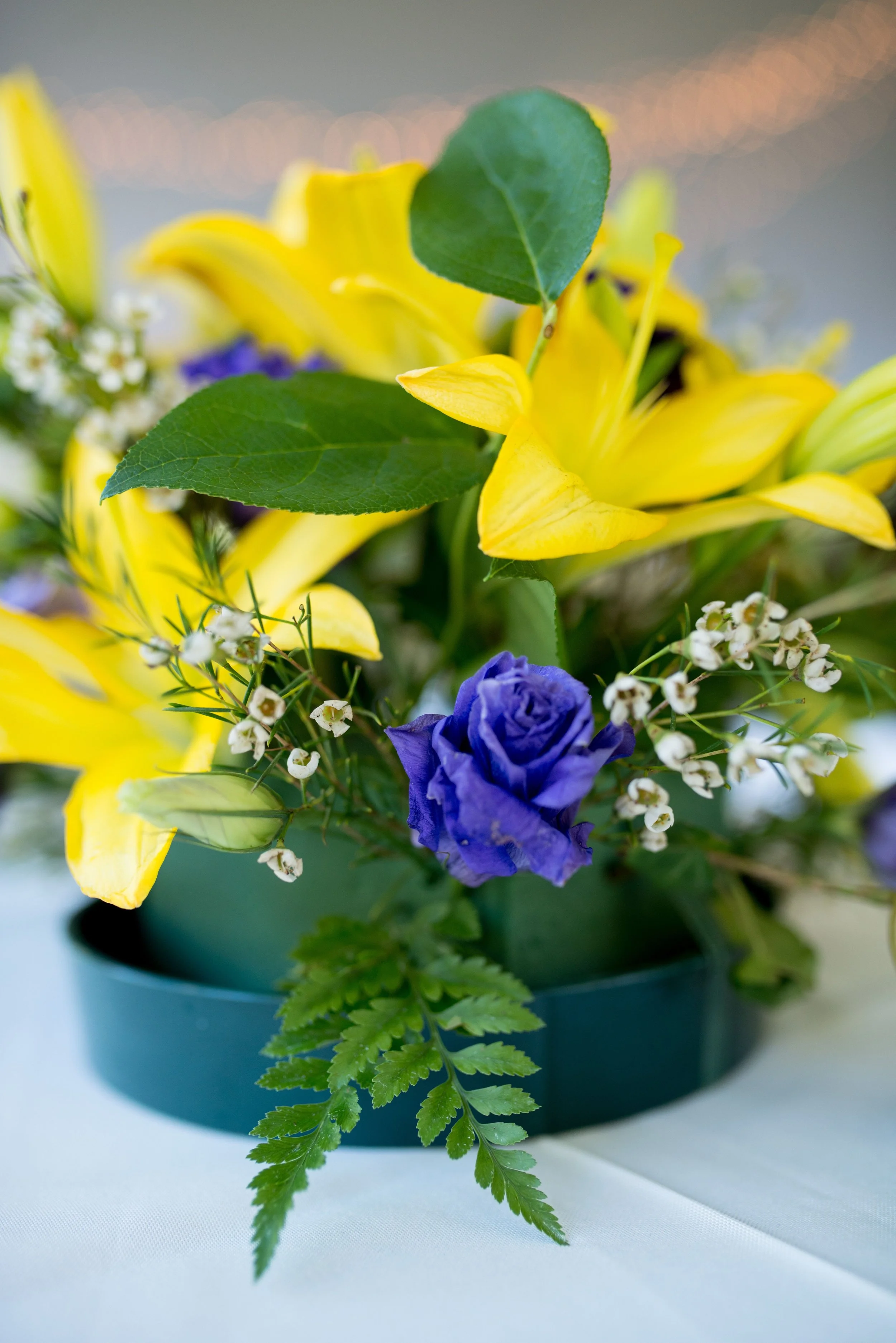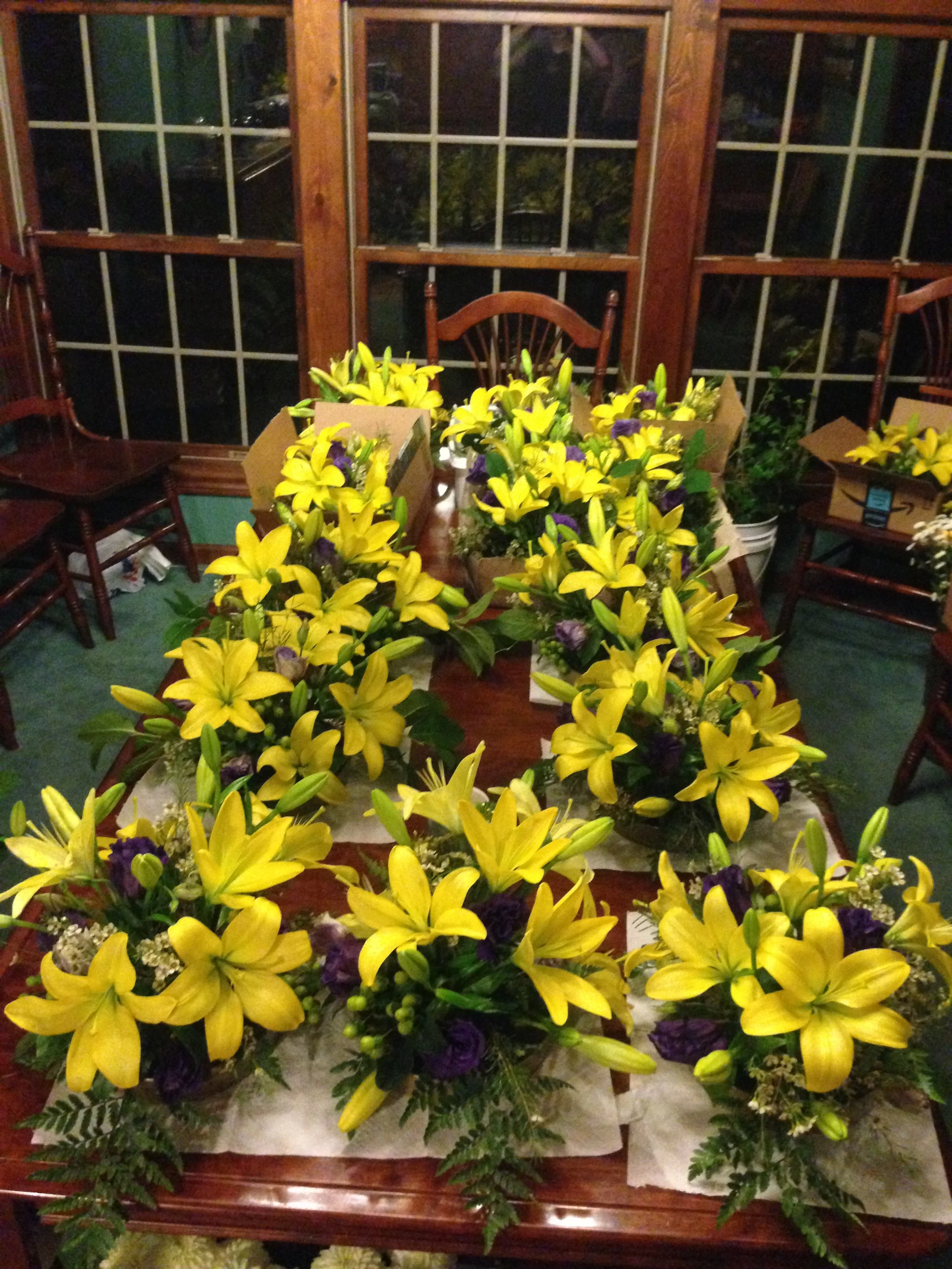 The combination of yellow, purple, and white flowers for this fall wedding complimented the changing color of the leaves. This color combination is one of my favorites, making it easy to work with. The challenge was the number of centerpieces.