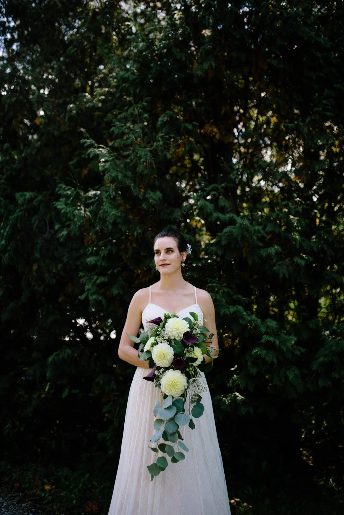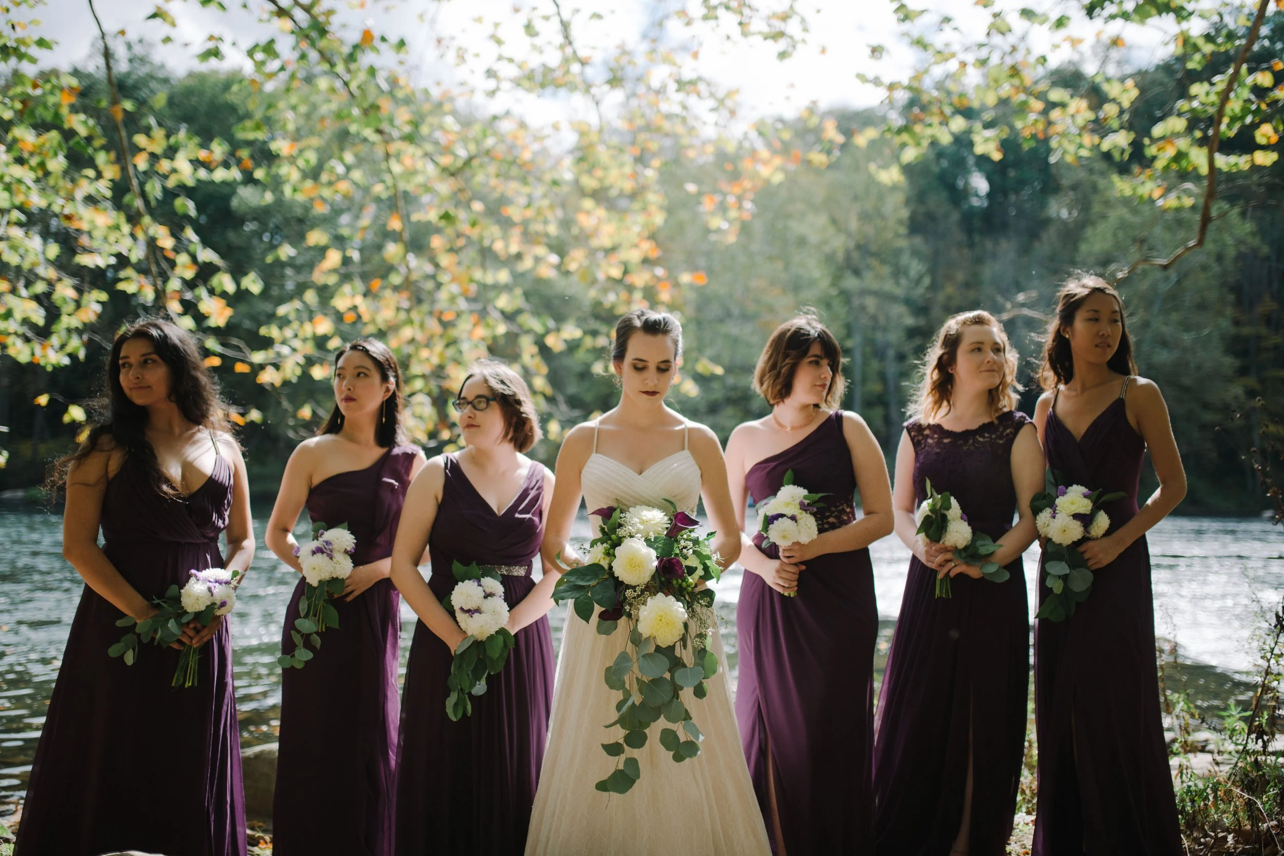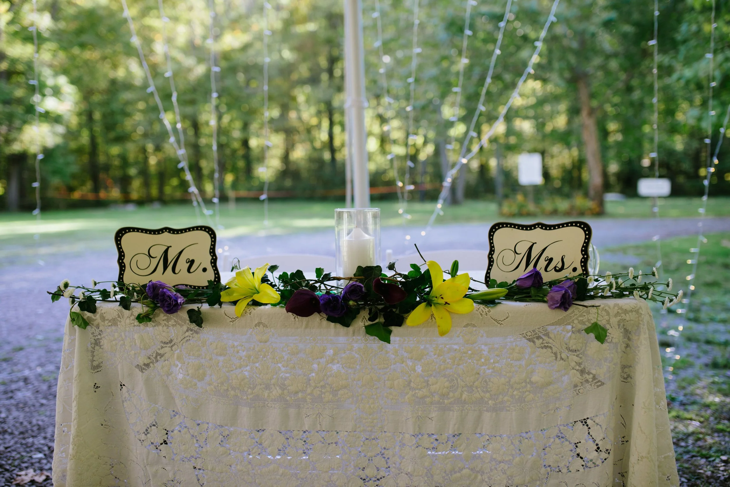 The combination of yellow, purple, and white flowers for this fall wedding complimented the changing color of the leaves. This color combination is one of my favorites, making it easy to work with. The challenge was the number of centerpieces.
