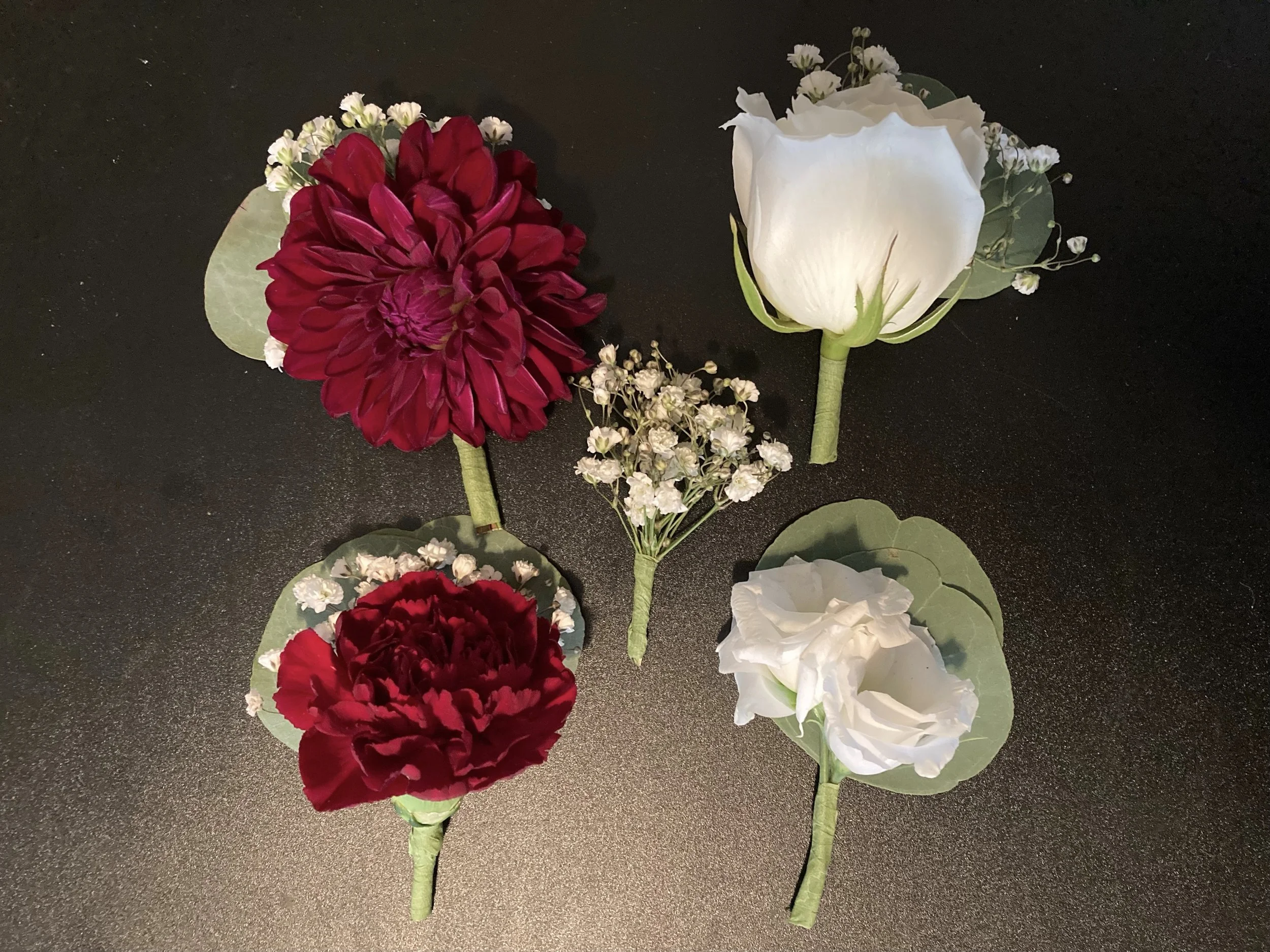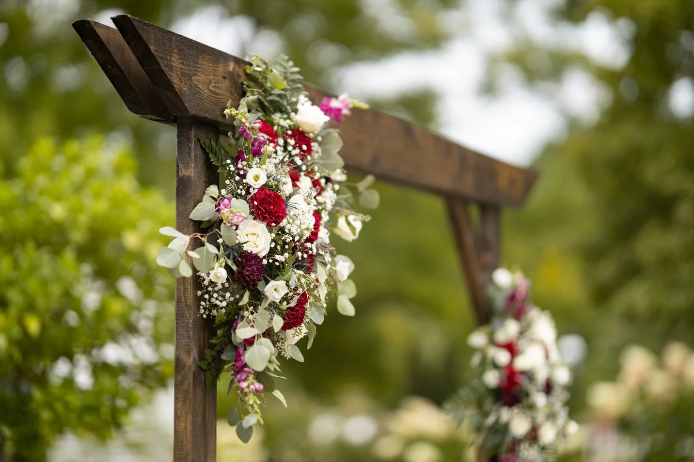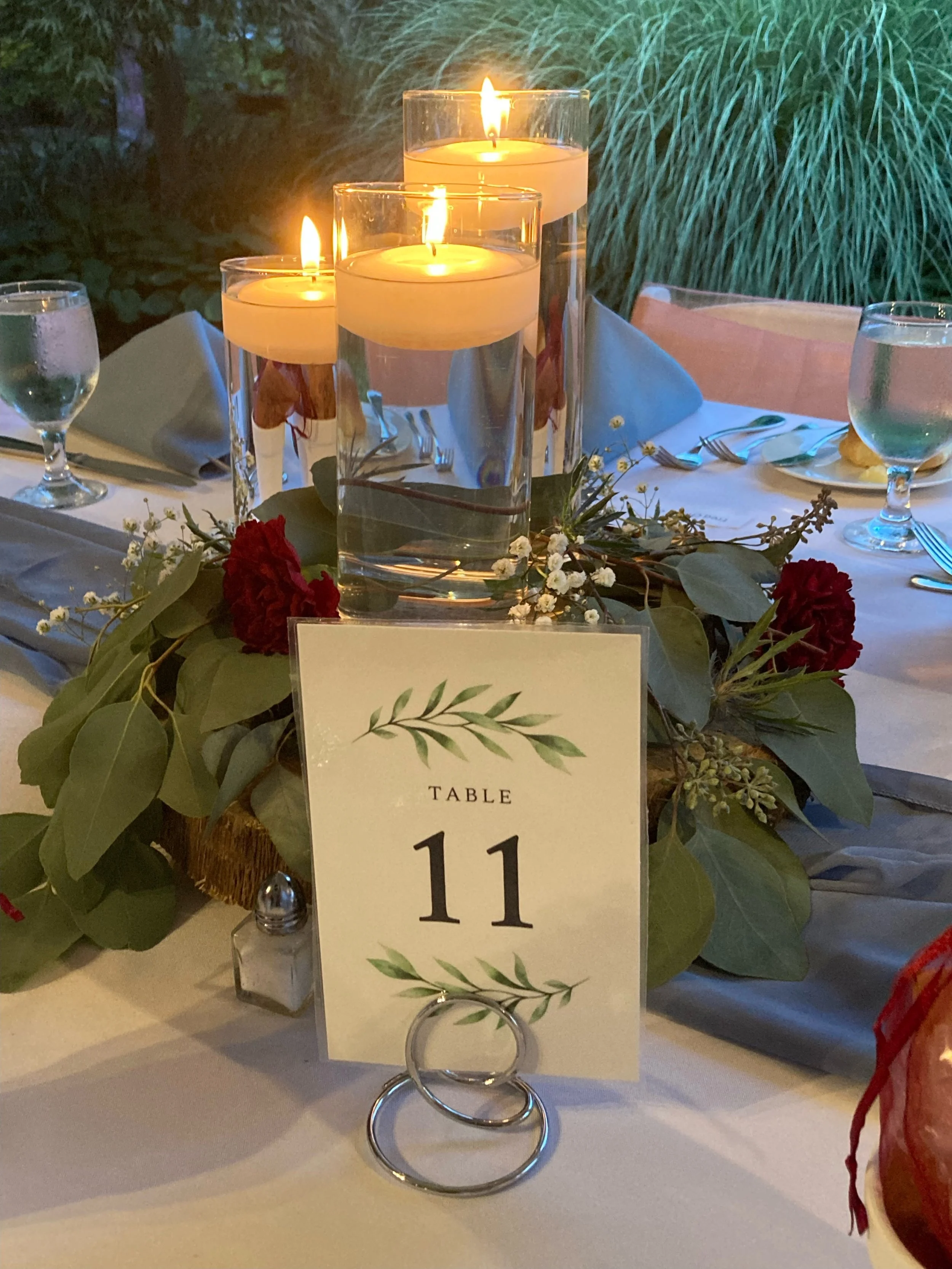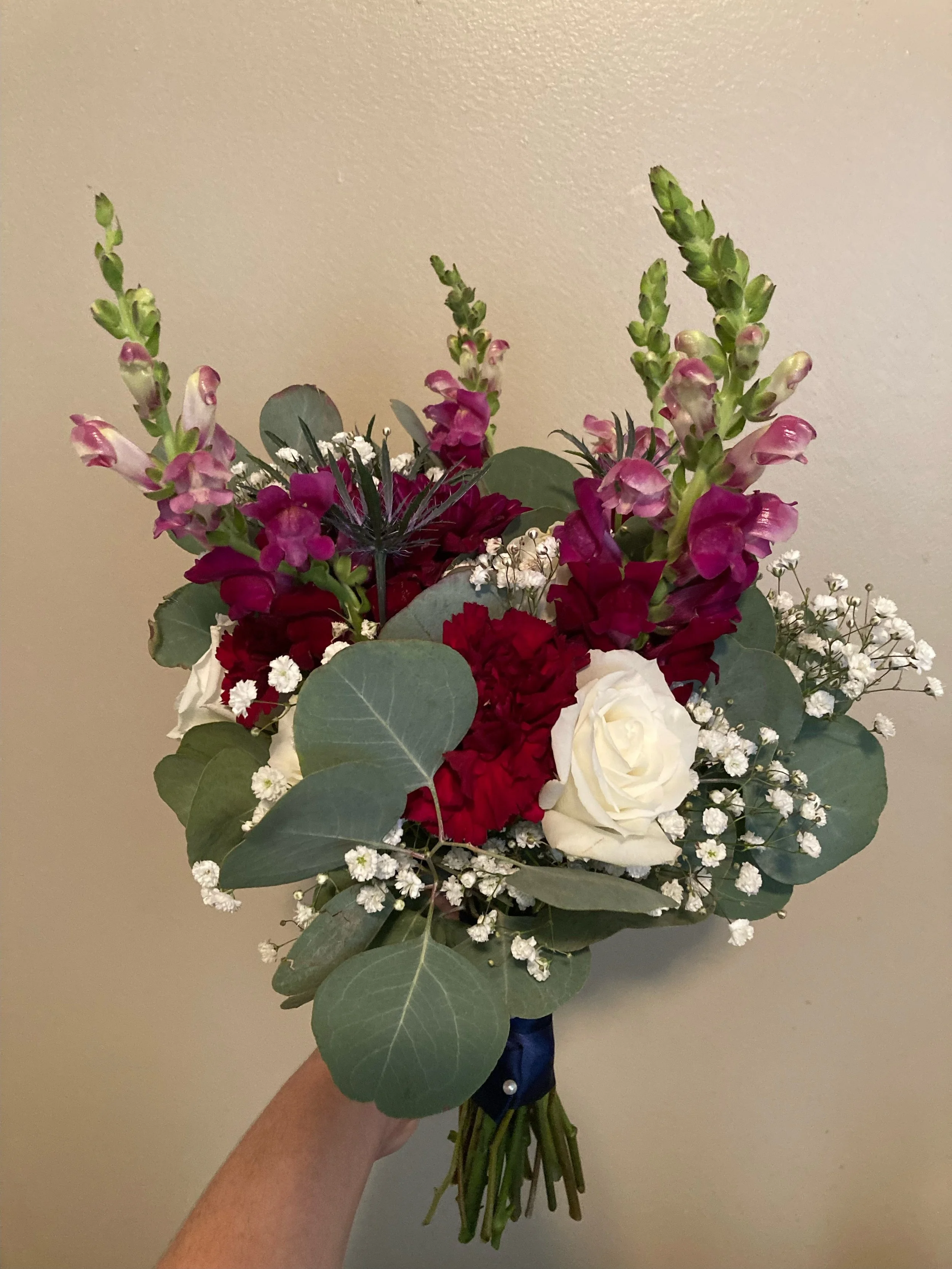 This autumn wedding beautifully applied an excellent color combination of navy, burgundy, and white. The centerpieces were loose eucalyptus with some flowers that matched the rest of the floral pieces to tie it all together.